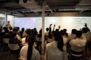 最初は緊張した面持ちだった生徒たちも、実際のキャンパスの映像を見たり、オーストラリアの気候や生活環境を教えていただくうちに、キラキラした目でメモをとる姿が印象的でした。