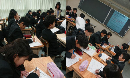 まず、各クラスの担任の先生が生徒役になって劇を行い具体的な場面を紹介しながら、自分も相手も気持ち良い「にこ-にこ(win-win)になる伝え方」を学びました。また、生徒ひとりひとりが自分だったらどんな風に表現するかワークシートに記入して、上手な気持ちの伝え方の練習をしました。メールのマナーについては、メールによる誤解をなくすために、「分かりやすく、ていねいに書く、強い言葉、紛らわしい言葉は使わない」「大切なことは直接話す」等、具体的な実例を使って学びました。
