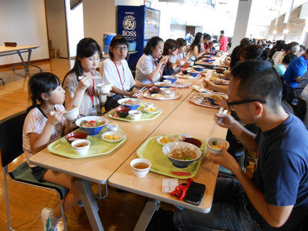 例年生徒さん達とは昼食の時間帯を分けるのですが、今年は同時間帯にいただきました。写真奥に小さく映っているのは、当日夢合宿中の高校3年生第2期の生徒さん達です。