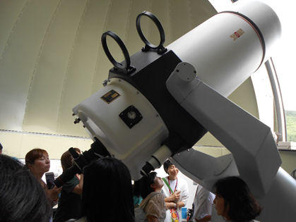 本館宿泊棟屋上には天文台があり天気のいい日には金星が見えるそうです。この日はあいにく雲が厚く望遠鏡設備を見学しました。
