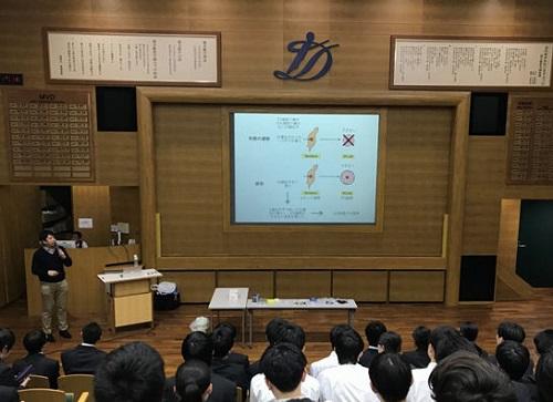 さらに定家先生は、歴代のノーベル賞受賞者である大隅良典氏や山中伸弥氏、大村智氏、また、まだ記憶に新しい本庶佑氏らの偉大な研究を非常に丁寧にかみ砕いて生徒たちに説明してくださいました。