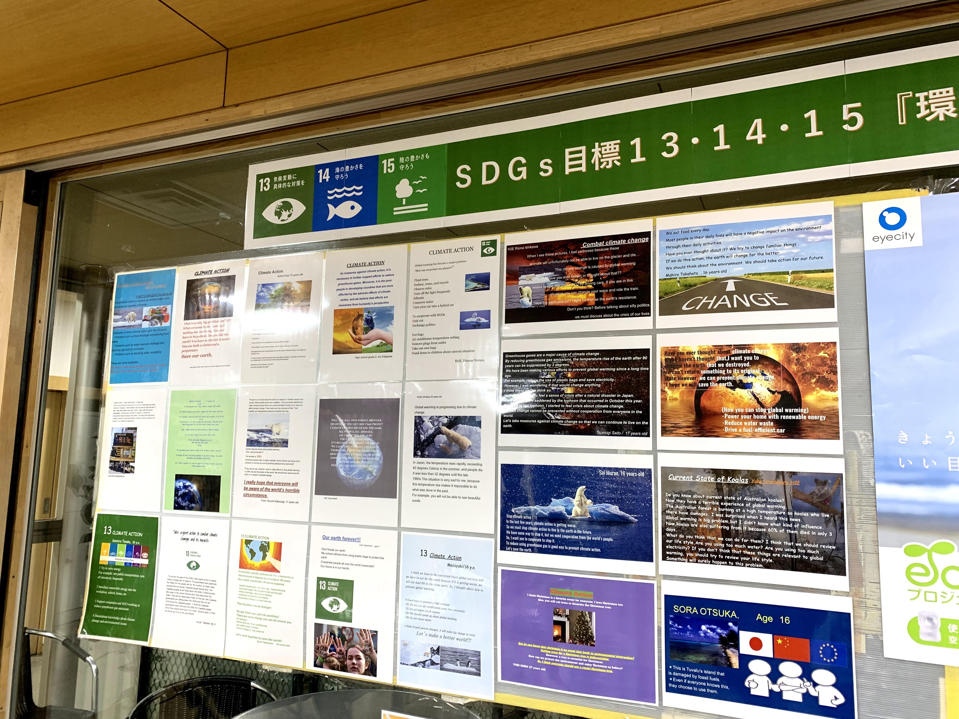 郁文館の本館4階の広いスペースには現在、SDGs目標13・14・15をまとめて「環境ブース」として展示を行っております。