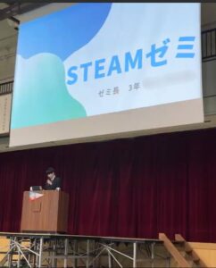 基調講演に続き、協働ゼミ(STEAM/エコロジー/メディア・アート/まちづくり/ビジネス/国際協力/アグリカルチャー/総合人間科学)の代表生徒による年間活動発表が行われました。