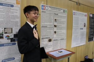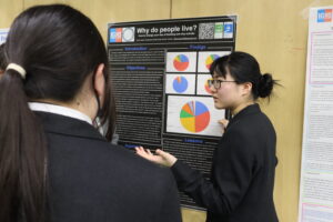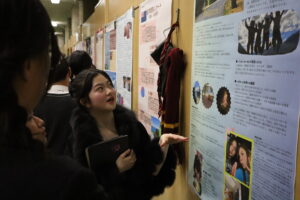 続いて行われたのは、各生徒によるプレゼンテーションです。生徒たちは帰国後に作成したポスターを用い、自身の留学先での学びや探究内容について、日本語・英語の両方で発表しました。