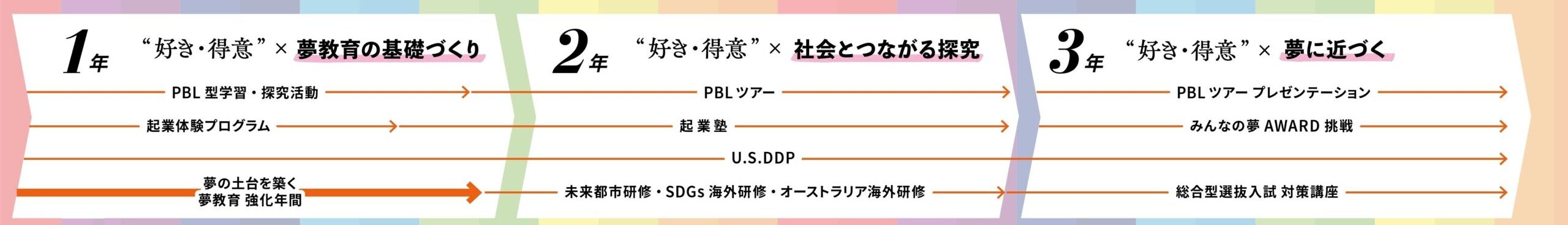 | 高校3年生 | PBLツアーでの体験を踏まえたプレゼンテーションの実施。またこの3年間の探究活動を通じて「自分の言葉で夢を語れる力」を育み、総合型選抜対策など夢の実現に向けて前進していく |