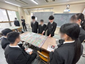 夕張(北海道)・屋久島(鹿児島県)・カンボジア・シンガポール・陸前高田市の5つの行き先について、話を聞く生徒たち。真剣にメモを取る様子も見られました。