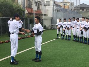 ノック終了後、大会の登録メンバー20名に背番号の授与を行いました。田中監督から番号が発表され、理事長から一人一人に背番号が手渡されました。