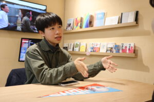 「生徒が中心となってグローバル高校のシンボルとなるロゴを作りたいから卒業生として力を貸してほしい。という話を聞いて、ぜひ力になりたいと思いました」と語りました。関わっていくなかで、後輩である生徒たちが主体的に考え、表現する姿に強い手応えを感じたといいます。
