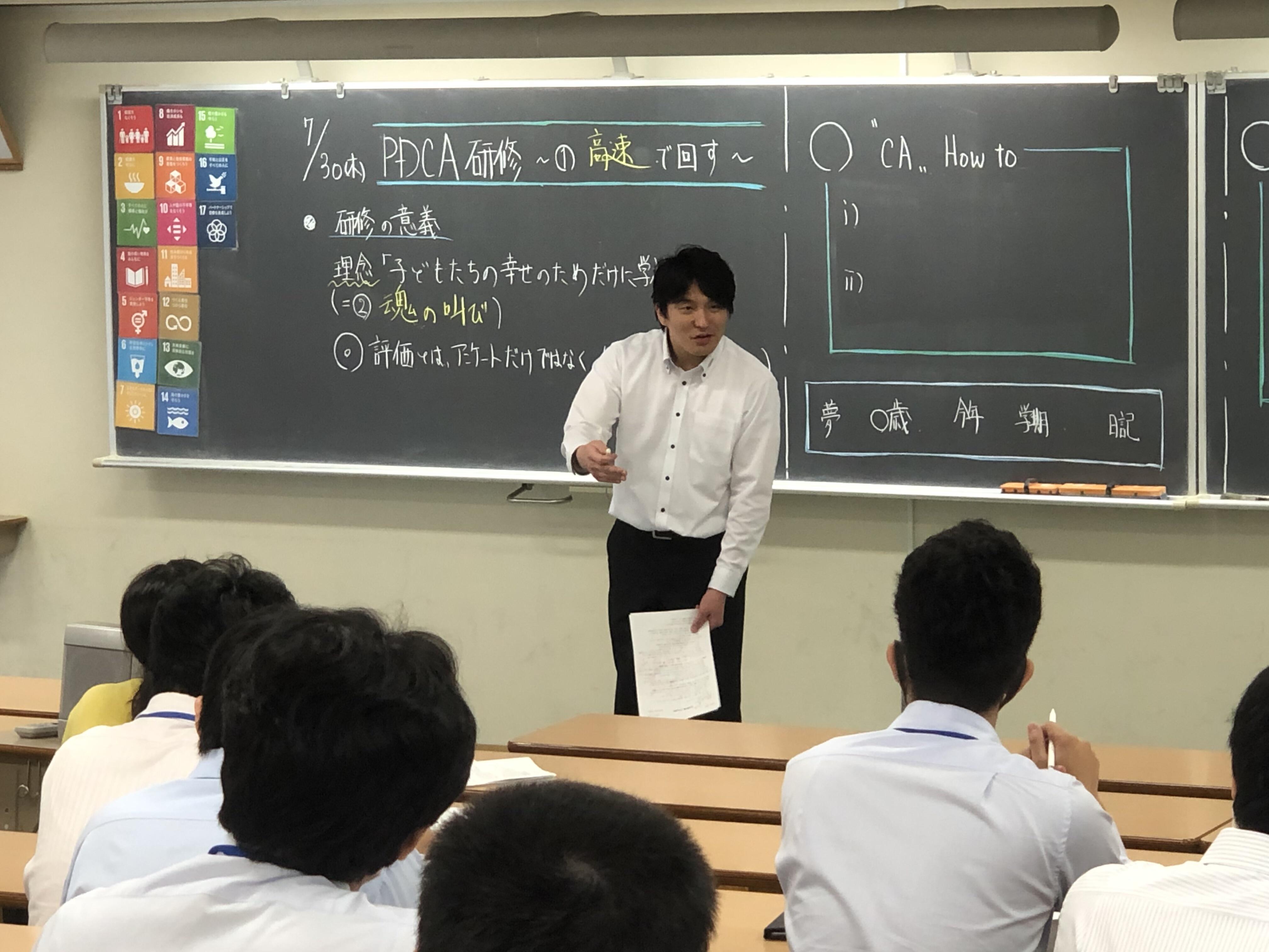本学園の「7つの約束~教職員編~」の一つに、「昨日より今日、今日より明日、授業のレベルを上げること」があります。これを実行するために必要なスキルを修得する、また、社会人として様々場面でも活用することができる『PDCAサイクル』を、本学園勤続5年目までの若手教員を対象にした研修を行いました。