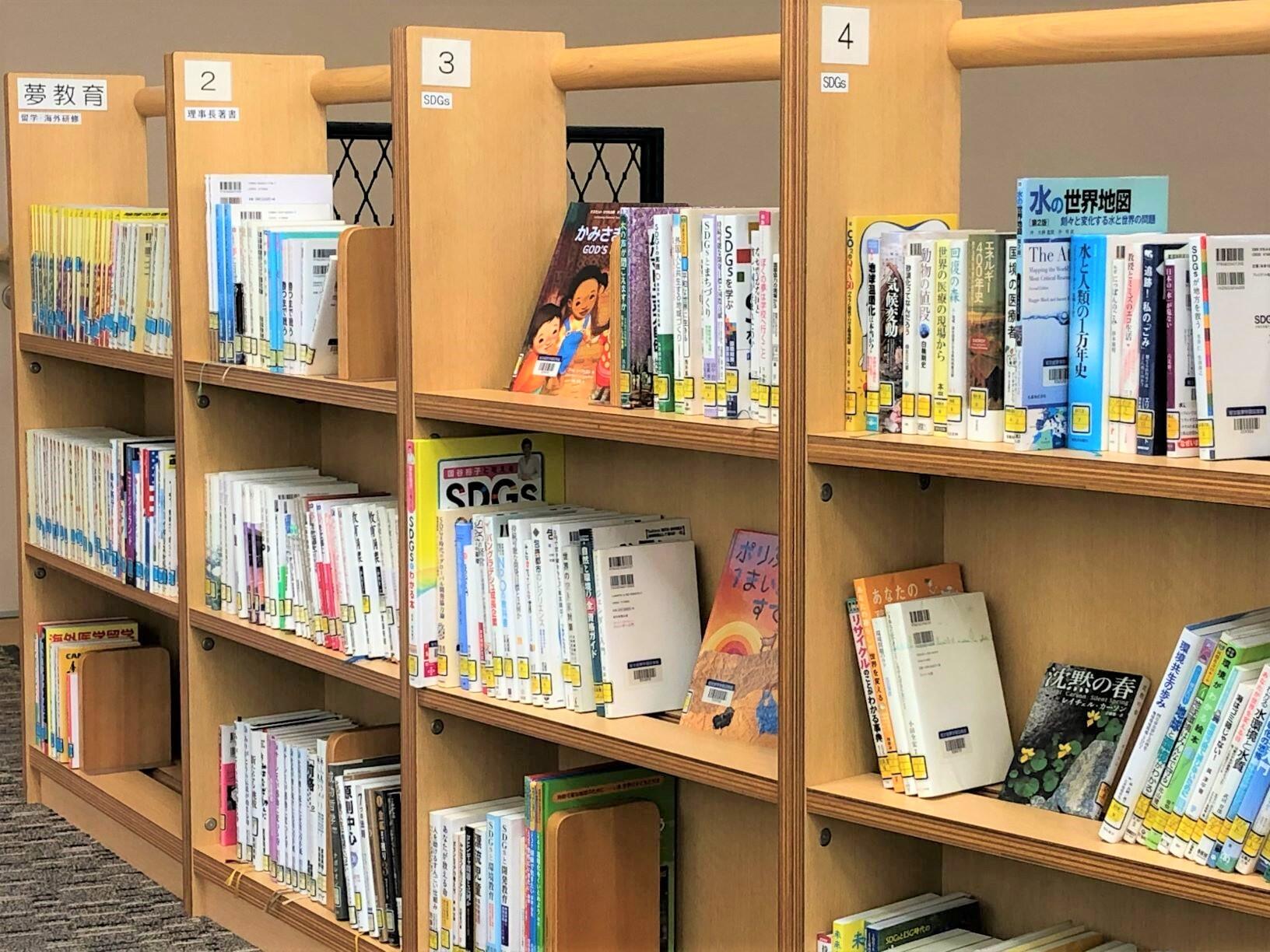 本校では、全教科・カリキュラム・学校行事などで実践型の「SDGs教育日本一」を目指して取り組んでおりますが、図書館でもSDGsに関連する本や資料を集め、教育現場をサポートしています。