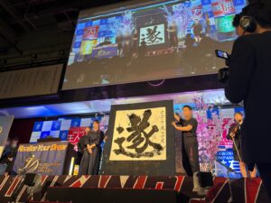 渡邉理事長より毎年恒例となる「今年の一文字」が発表され、圧巻のパフォーマンスを書道部が披露。