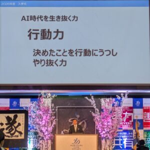 そして、今年度から“AI時代を生き抜く力”もみなさんに身につけてほしいと思っています。このAI時代は、18世紀の産業革命に匹敵する変革であり、人の学び方、働き方、生き方の全てを変えるでしょう。 AI革命によって世界中で人間の仕事が変わるものすごく大きな変化が生まれます。今からはAIができることをするのではなく、人をまとめるリーダーシップ、つまり人間力がより大切になります。みなさんにはこの激動の時代を強く生き抜く力を身につけ、必ず幸せになってほしいと思います。