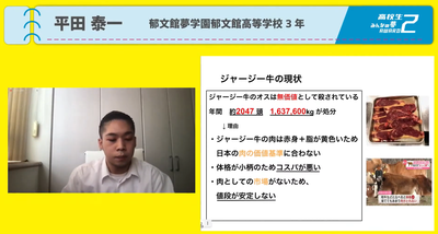 平田くんは中学時代から”食”に関係する探究を続けており、高校進学後は本校が独自に設置している高校生版MBA”起業塾”のメンバーとして様々な活躍を行ってきました。