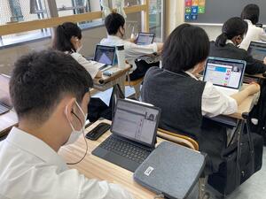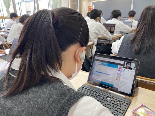 特に高校のe特進クラスでは、授業の中で週5回のペースで毎回25分間の「席上留学」を行っています。