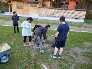 協力して穴掘りから始まり、施肥、固定、添え木をして、最後は鹿よけの匂い袋をつけて終わりました。2時間に及ぶ作業でしたが、4本の桜を植える事が出来ました。