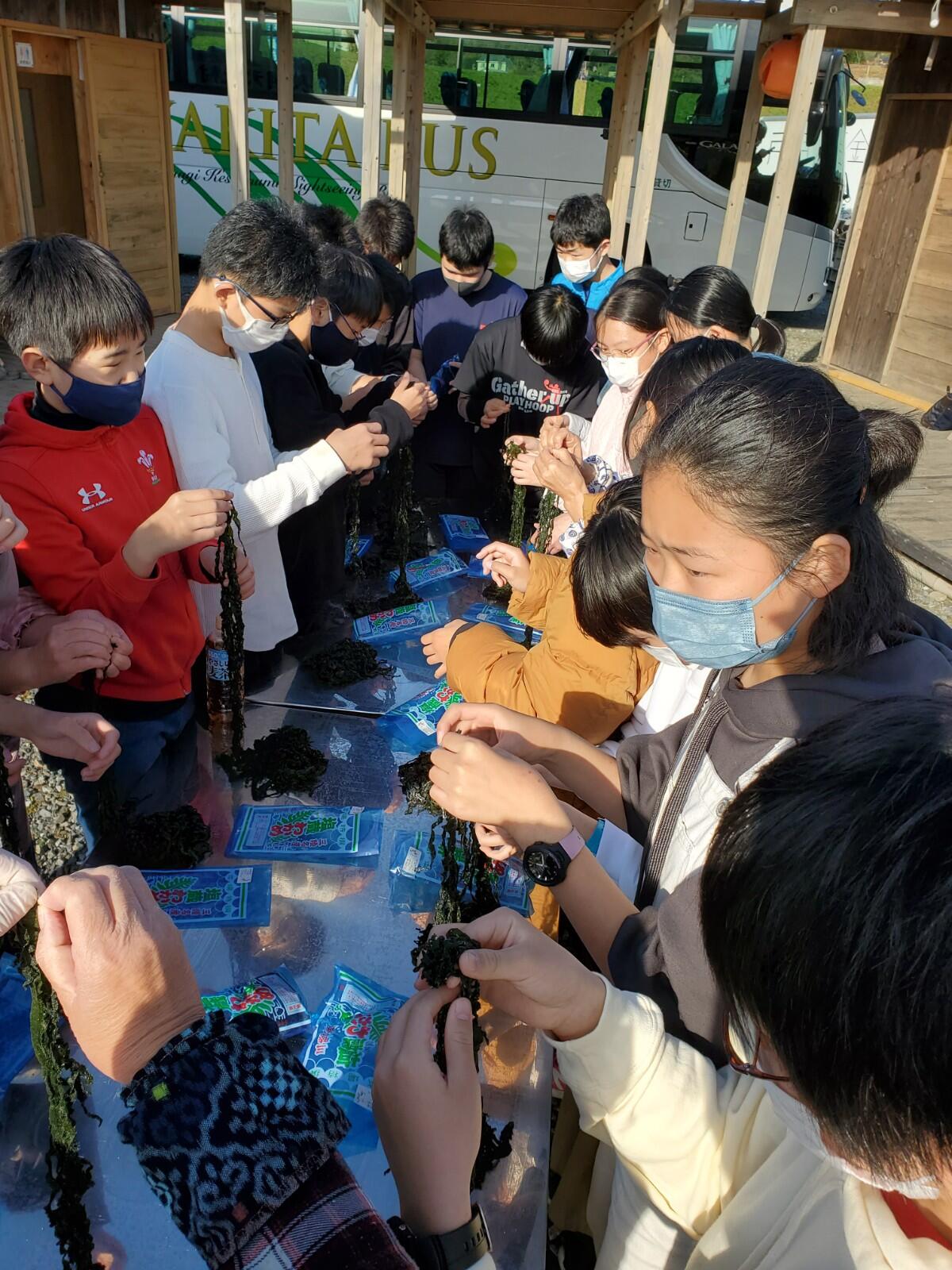 地元のお母さんたちがつくったお昼ご飯をご馳走して頂いたり、わかめの芯抜き体験などを楽しみました。