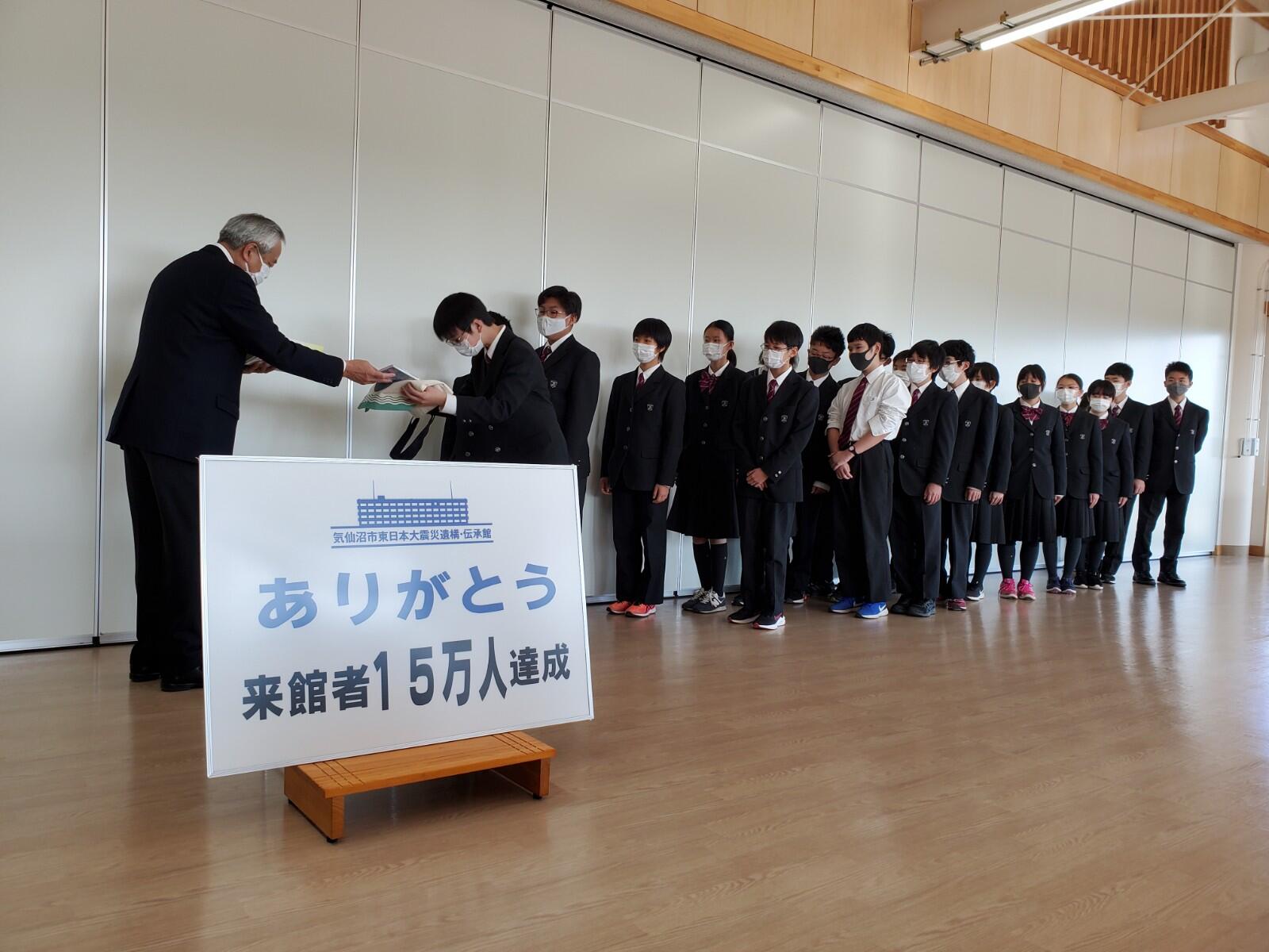 そして、我々の団体が来館15万人目ということで、気仙沼市長さんから「若い皆さんが、防災意識を高め、その意識を広めてくれることを期待します。」のお言葉をいただき身の引き締まる思いになりました。