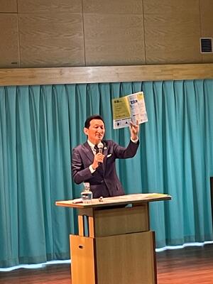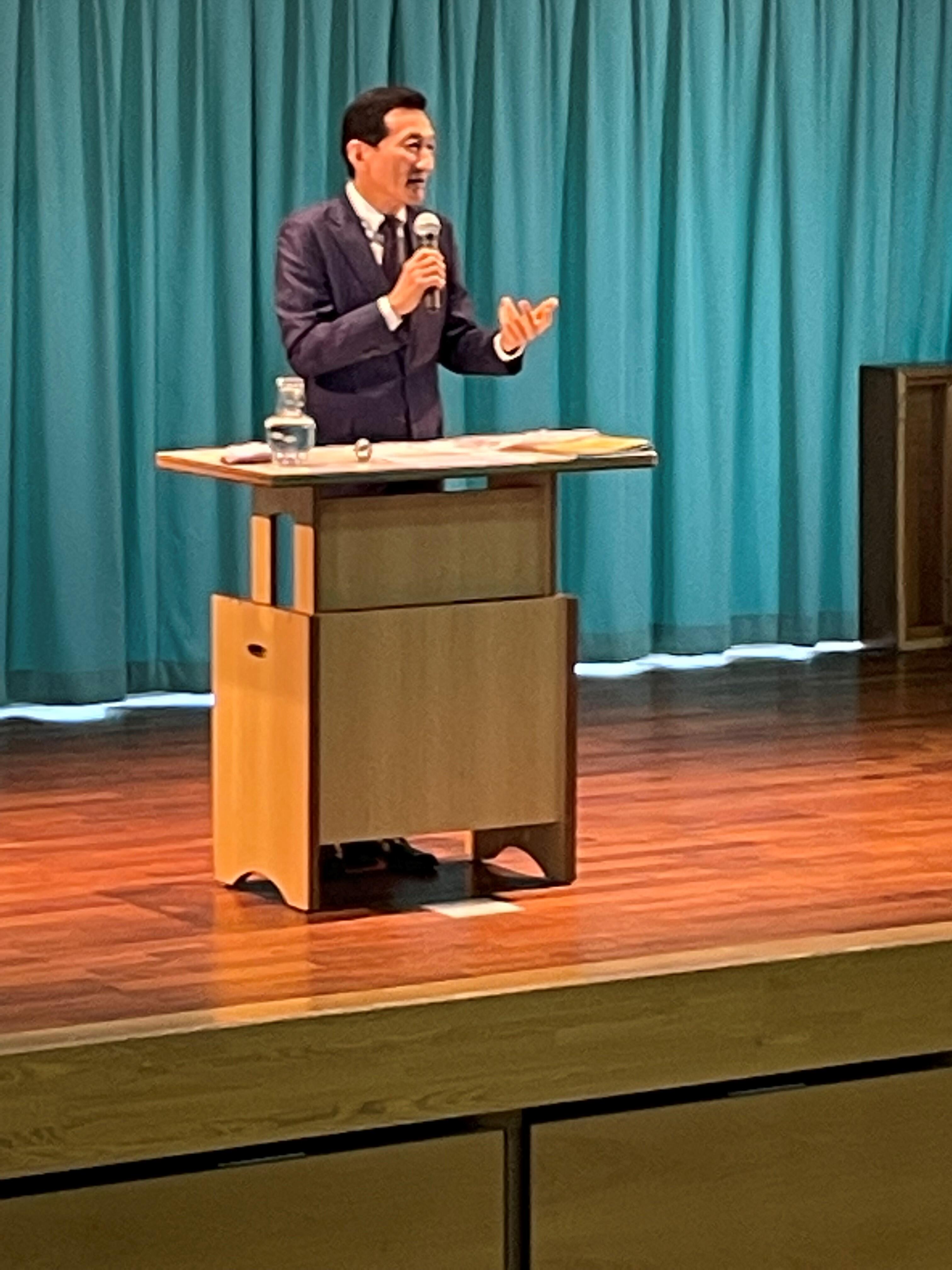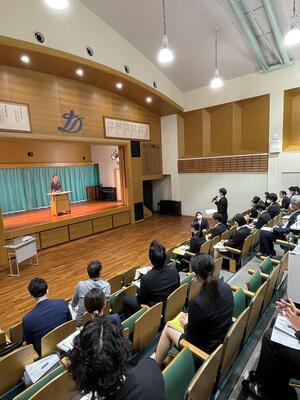 昨年はコロナの影響もあり、オンラインのみの開催でしたが、今年は直接来校しての参加を希望される方が多く、学園講堂での開催となりました。事前に理事長兼校長に直接聞いてみたい質問を募り、その質問の内容に応える形式で進められました。