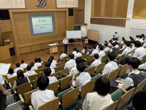 冒頭では、理事長先生が現在取り組んでいるビジネスや社会貢献活動に関する動画を視聴しました。そして、そのような現在に至るまでのご自身の人生経験についてお話しされ、人生を設計できる人間になるために、日頃から「夢7原則」を意識するよう生徒たちに伝えました。また、人生における「運」の重要性に触れ、運を味方にするためには周りの人から応援される人間になることが必要で、そのためには「七つの約束」を守ることが必要だと話されました。