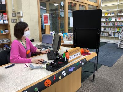 Happy Halloween! 気がついたら夜も長くなり、秋もグッと深まってきました。 図書館では、秋の夜長に読む本をじっくり探してもらおうとハロウィンムード満点にして生徒をお迎えしています。館内1階のいたるところでハロウィン気分を感じてもらえるのではないでしょうか(自信アリ☆です)。