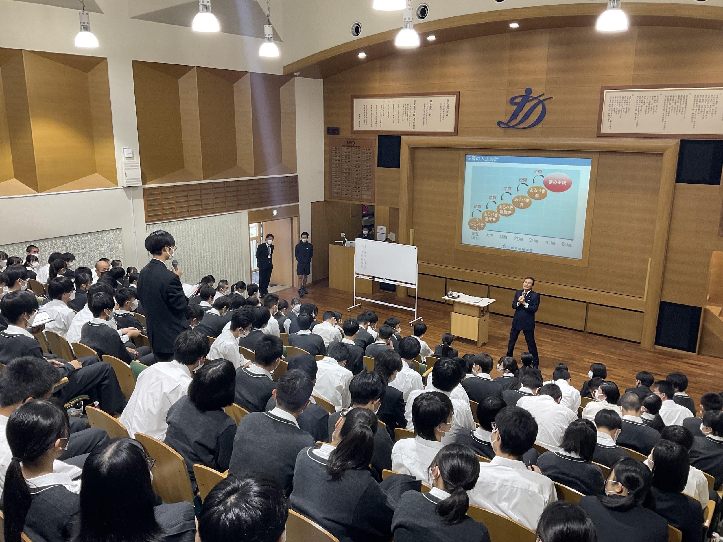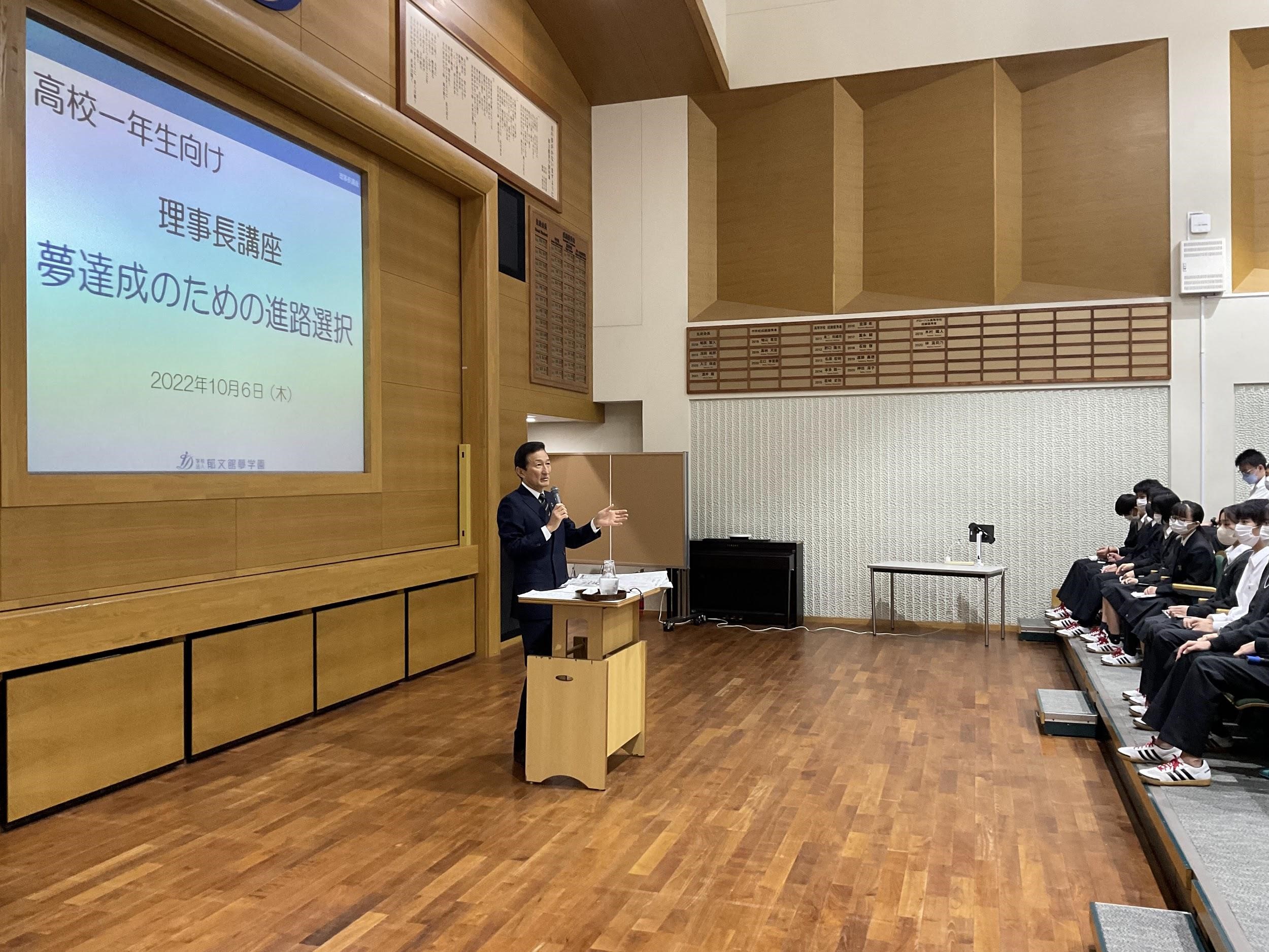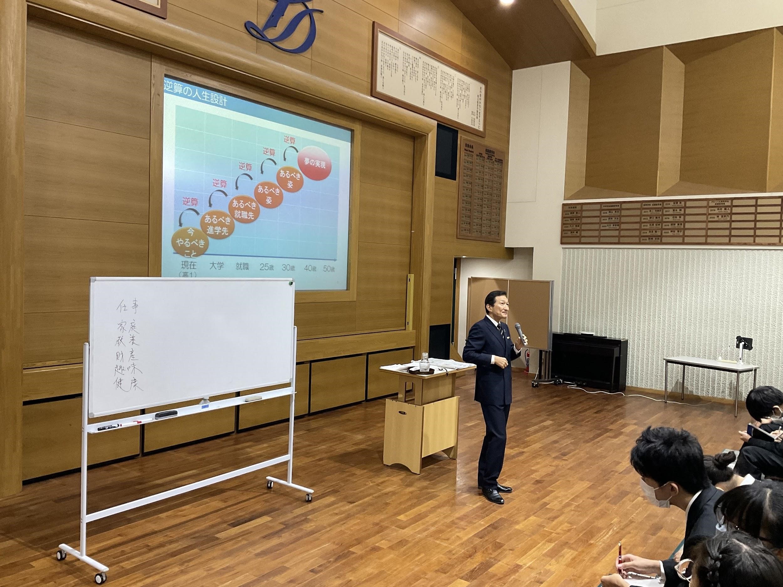 今回は、来年度へ向けた文理選択にあたる高校1年生を対象に理事長のこれまでの人生、そして今後の夢への考えと思いを夢からの「逆算思考」というキーワードの元、講義していただきました。