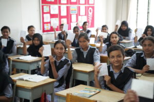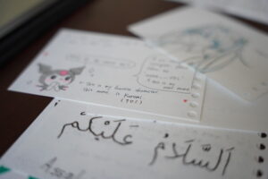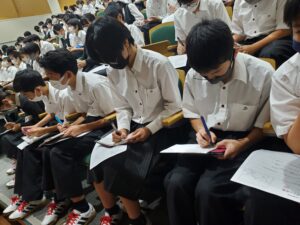 1時間目の授業の時に、現地でのあいさつ「アッサラームアライクム(こんにちは)」を練習し、2時間目の最初には現地校事務職員で通訳も務めるアラムさんに現地の言葉で挨拶をしました。またオンラインスクールツアーでは、校門、グラウンド、体育館、教室、図書館、屋上など様々な場所を案内していただきました。その後、バングラデシュのパートナー生徒にメッセージカードを記入しました。「相手がどんな表情になってくれるか」を想像しながら、バングラデシュのパートナーの名前やメッセージ、質問などを英語で記入します。中にはメッセージカードの裏面にバングラデシュでも非常に関心が高い日本のアニメの絵を描いている生徒もいました。
