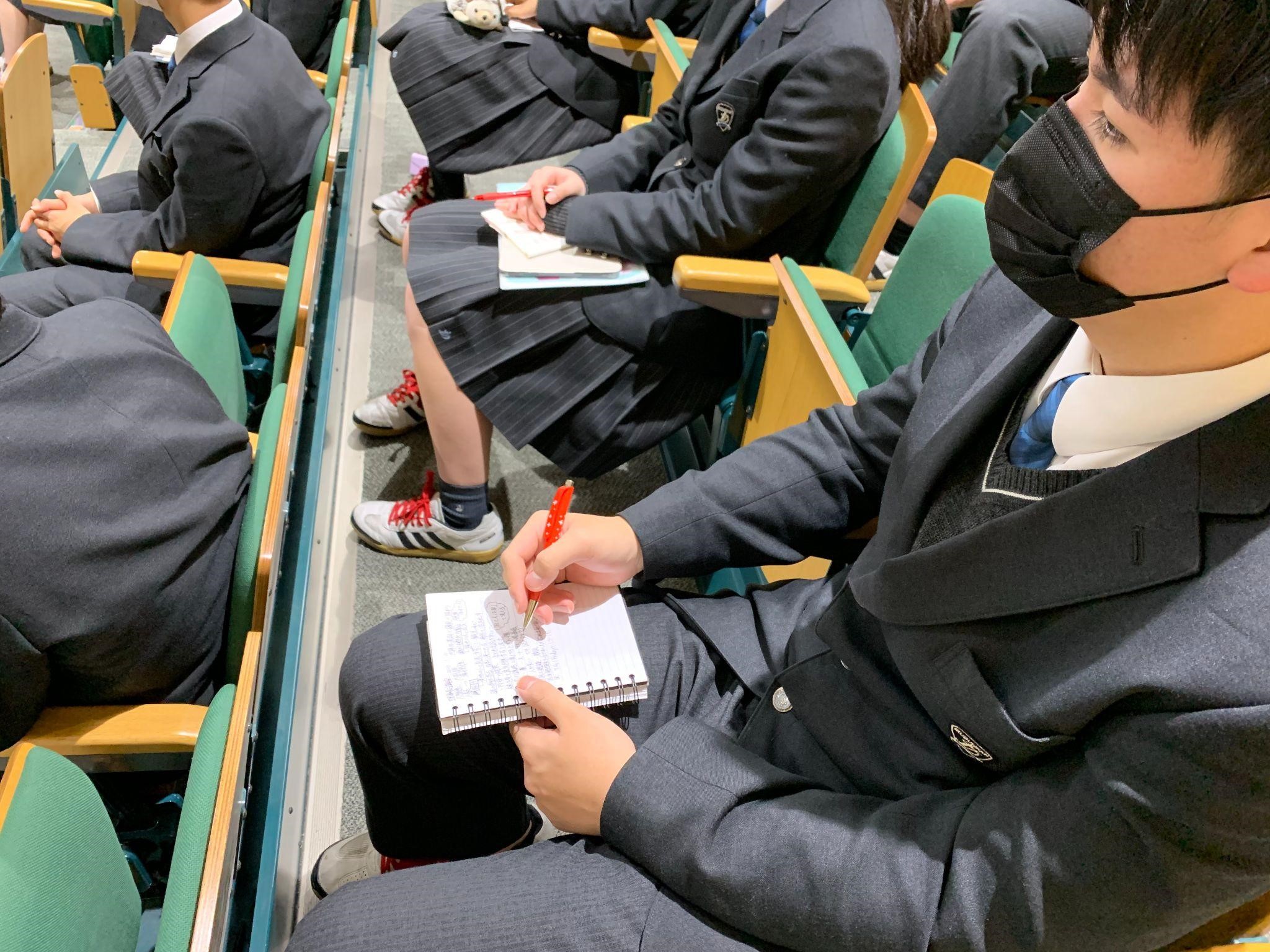 グローバル人材(国際人)になるためには、「人格」つまり人間性が大事になること、そして「専門性」が大事であることを理事長兼校長自らの体験を通し教えてもらいました。いつも以上に夢中になり、メモを取る様子が見られました。