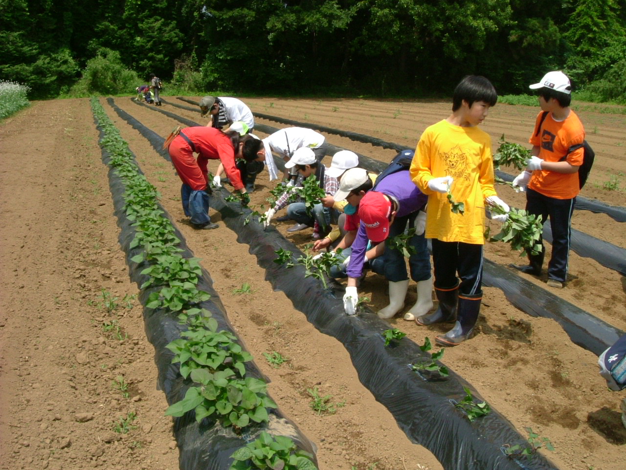 みんなで作業開始!この畑で収穫した有機サツマイモを10月の郁秋祭(文化祭)で販売する予定です。