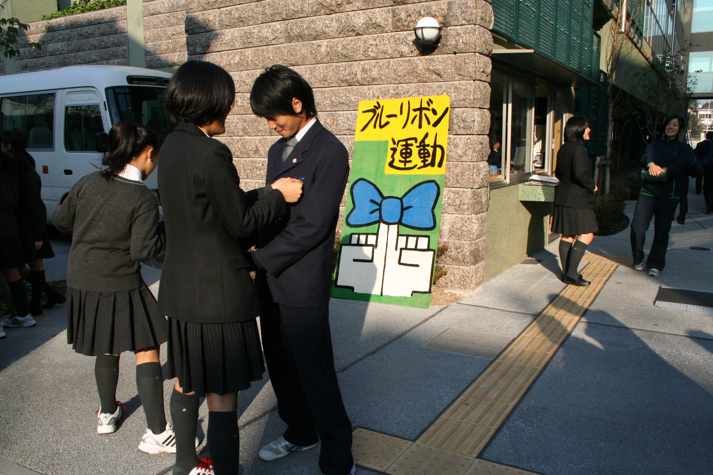 この活動の目的は、平和とコミュニケーションを象徴する青色のリボンをつけることで「人の心や体を傷つけない」という気持ちを生徒一人ひとりに持ってもらうことです。