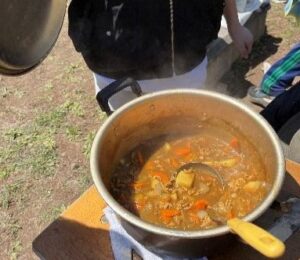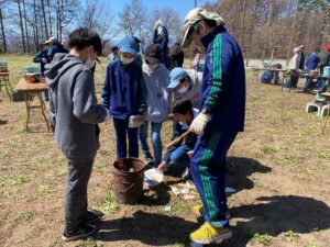 5日目は、生徒待望の野外調理を行いました。グラウンドで班に分かれて基地を作り、カレーライスを作って食べました。火をおこしたり、野菜を切ったりと初めてのチャレンジもたくさんありましたが、皆で助け合って作業できました。チームで協力しながら作ったカレーライスを、青空の下みんなで食べたことは、とてもいい思い出になったことでしょう。
