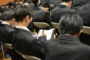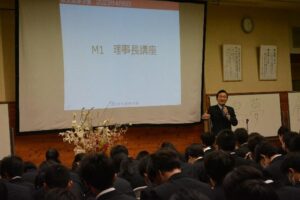 まず初日は、理事長講座を行いました。生徒たちは、幸せに生きる方法や夢の叶え方などを理事長から直接学びました。また、生徒に熱いメッセージとして印象強く残ったのは、「七つの約束」でした。七つの約束は、郁文生がそれぞれの人生を主人公として歩めるように「①笑顔で元気よく挨拶せよ、②約束を守れ嘘をつくな、③すべてに感謝せよ、④自らの夢のために限界をこえた努力を継続せよ、⑤損得ではなく善悪で判断せよ、⑥他人の喜び悲しみを共有せよ、⑦正しいと信じ決めたことは諦めず最後までやり遂げよ」という当たり前でありながらも常に心得るべきこととして、理事長が生徒に送った言葉です。運さえも味方につける人生を歩むために、最低限のことは約束しようと生徒がうなずく瞬間を見て、教職員も改めて重要性を再認識したお話でした。質疑応答では、目をキラキラと輝かせたたくさんの生徒たちが手を挙げ、たくさんの質問を通してより深く学ぶことができた講座になりました。