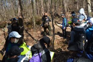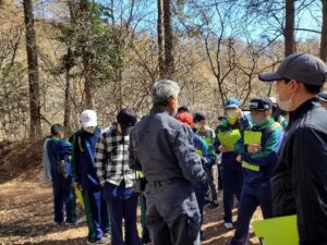 森林体験では、事前にレクチャーを受けた後、東御市と協定を結び森林保全活動を実施している「東御の森」へ行き、都会とは違う森の空気に触れました。森でしか見ることのできない発見に、視覚、聴覚、嗅覚、触覚、味覚を全て活用して、森林再生の重要性を体感しました。