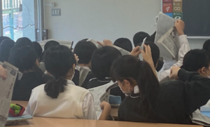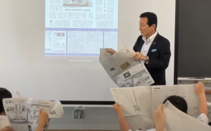 次に日経新聞を使い、東証プライムの株価や中小企業の記事を例に、どのように日本経済が変容しているか、また今の日本の経済界では何が注目されているかを、新聞の読み方も含めて教えました。このパートでは論語とは打って変わり、学校の先生としてではなく経営者としての目線で日本の現状を伝えました。生徒たちは、夢を具体化するヒントの探し方を知ることができたと思います。