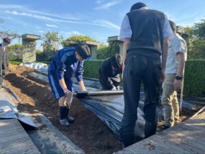 出来上がった畝の上には、地温の調節・雑草抑制・乾燥防止・病気予防などの効果が得られるマルチシートと呼ばれる資材で畝の表面を覆います。シートの両端を生徒2人で持ちながら、協力して設置しました。