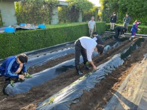 最後には、農業研究会が苗植えを行っている噂を聞きつけた生徒らが、屋上農園に集まり、農業研究会の生徒だけでなく他の生徒も一緒に協力しながら苗植えを行いました。