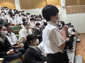 まず、いのちについてのお話がありました。理事長が自身の実体験をもとに、時間は有限であり、限られた時間をどのように使うかが大事であると伝え、生徒たちは真剣な表情で話を聞いていました。「3泊4日の修学旅行をどのように過ごすべきか。」出発前に改めて考えることができたでしょう。