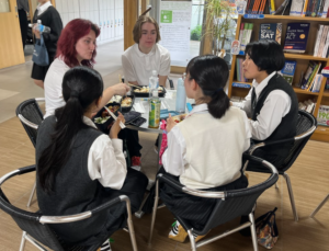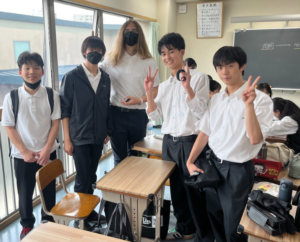 来校後すぐに、本校の生徒がスクールツアーを実施しました。教室などの学校内施設を案内すると、授業スタイルや校舎の作りの違いに興味津々な姿が新鮮でした。