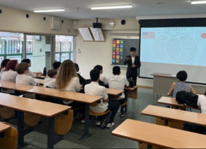 スクールツアー後に開催した歓迎式では、グローバル高校の鎌倉教頭先生から日本語と英語を交えた挨拶が行われました。Monte Vista High Schoolの生徒らは、選択授業で日本語を学習しているため、鎌倉先生からの日本語の質問に少し戸惑いながらも、知っている日本語を混ぜながら答えていました。中には、「なんで日本人は、授業を静かに聞いているの?」など、スクールツアーで感じた母国との違いを質問するMonte Vista生の姿もありました。