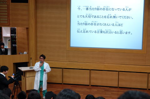 先生は、産婦人科とは何か、分娩はどのようにして行われるのか、人はどのように生まれるのか、生まれる確率の小ささとその凄さなどについて生徒たちに熱く語って下さいました。