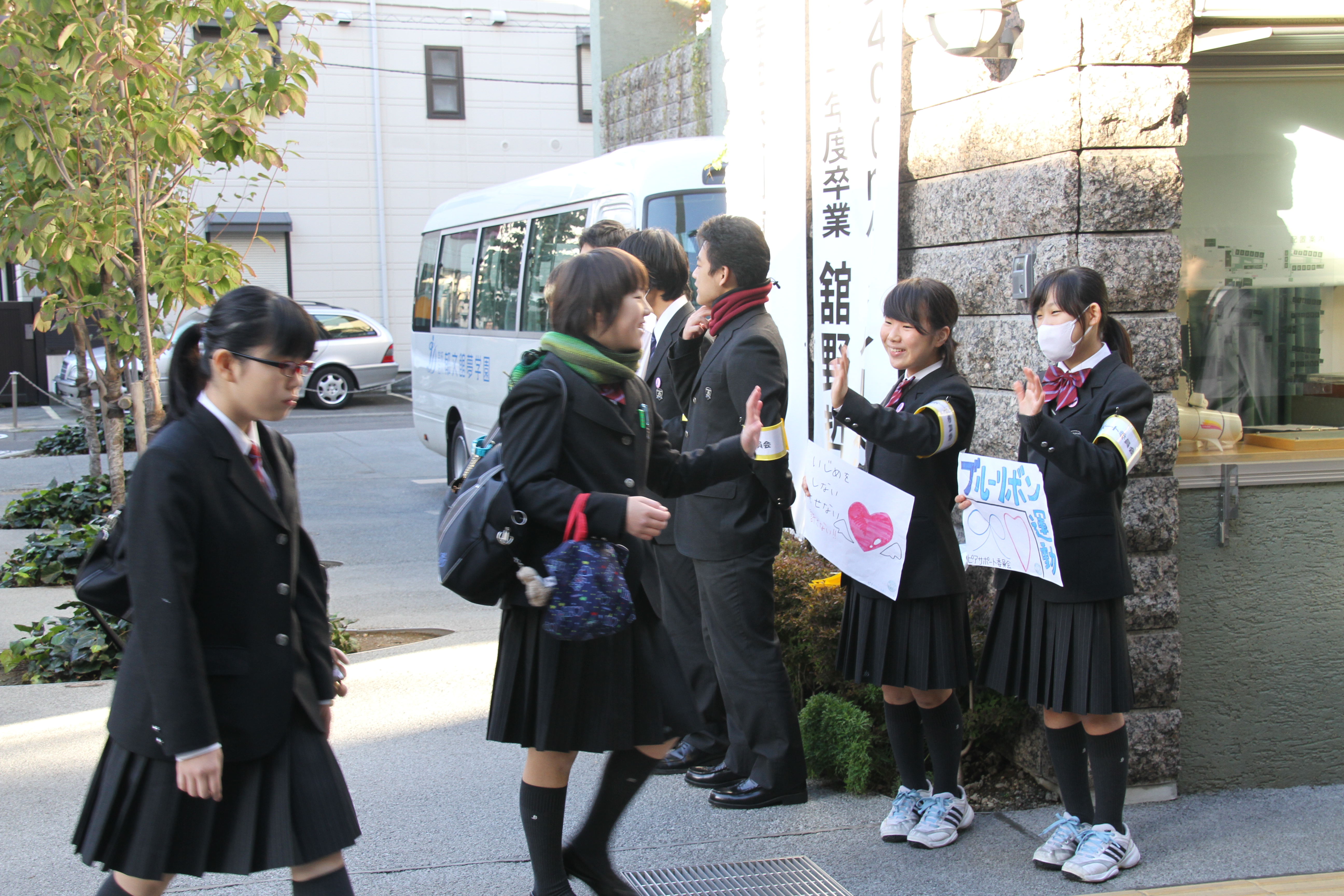 ↑ ブルーリボン運動をしていると、登校する生徒が声をかけてくれます。気持ちの良い光景です。