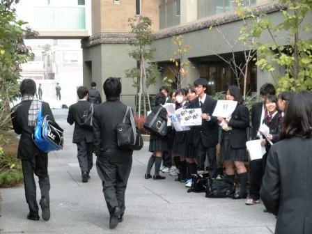 今回のブルーリボン運動期間中も、ピアサポート委員は、毎朝校門に立ち、登校してくる生徒達にブルーリボン運動の重要性を伝えていました。写真は、毎朝校門にてブルーリボン運動を伝えるピアサポート委員の様子です。