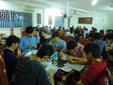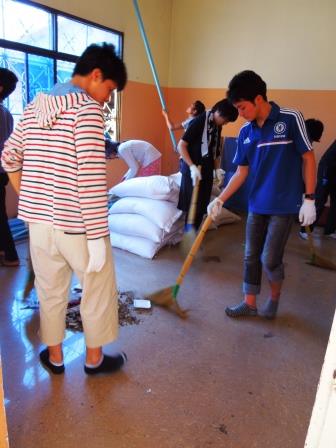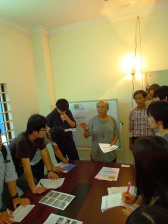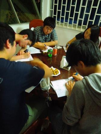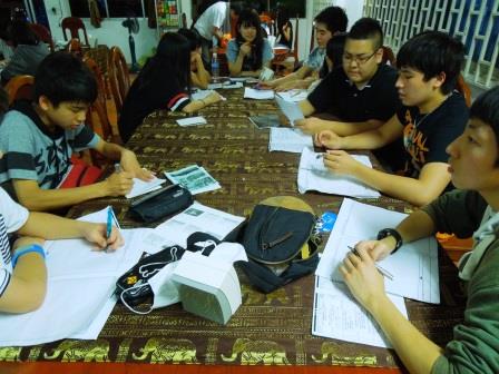 この研修期間中、生徒たちは毎晩ミーティングを行っておりました。その日一日の研修を各自で振り返ってワークブックに記入し、その後グループで意見交換を行いました。グループは毎回ランダムに組まれ、高校生も中学生もなく、研修に参加した一生徒として積極的な発言がみられました。最終日には、代表生徒が全体の前で発表をし、皆がその意見に真剣に耳を傾けていました。