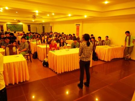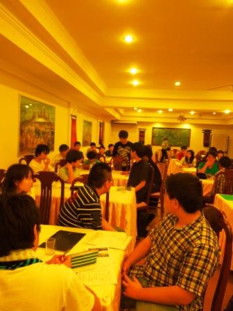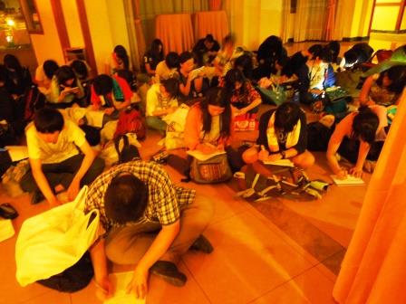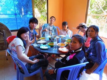 成田に集合し、バンコク経由でプノンペンへ。順調に行けば、夕方にはプノンペンに到着するはずでしたが、バンコクで思わぬ足止め。バンコク空港で5時間ほど待機をすることになりました。しかし、生徒たちは、そうしたトラブルにも臆することなく、空港内で食事をし、研修のワークブックや孤児院の資料等に目を通し、これから始まる研修の準備にその時間を使って過ごしました。そして、深夜1時にプノンペン空港に到着。ホテルに着いたのは、なんと深夜2時でした。生徒たちは、翌日の孤児院訪問に備えて、速やかに就寝し、ハードな1日目は終了しました。