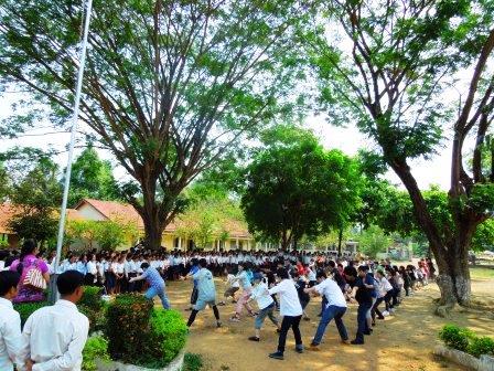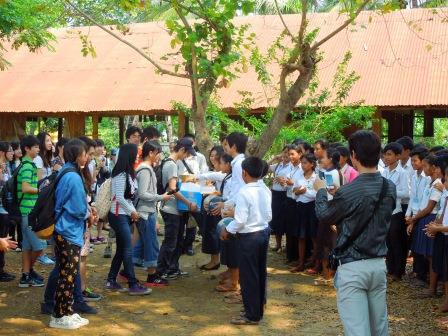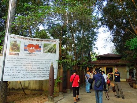 ポーサットを発ち、カンボジア第三の都市バッタンバンへ。今回のカンボジア研修では、初めて現地校との学校交流が実現いたしました。今回交流する学校は、生徒数500人の「ワットタムン中学校」です。この学校の校舎は、SAJの援助により新校舎が完成したばかりです。私たちが到着すると、全員で盛大にお出迎えをいただきました。開会式では、生徒が2ドルずつ出し合って購入した本(英語クメール語の辞書、英語の絵本や教材)、日本から持参したボールや大縄を寄贈させていただきました。そして、ここでもソーラン節を披露することができました。現地校の生徒たちは、日本から来た学生たちの踊りを笑顔で楽しんでくれました。 寄贈した本は、この図書室で活用されます。 午後は、「アキ・ラ地雷博物館」を訪れ、最終目的地のシュムリアップへ。現在もカンボジアには、数多くの地雷や不発弾が地中に存在する事実を目の当たりにし、その撤去を命がけで行うアキ・ラ氏の活動や未だ深く残る内戦の傷跡について学びました。 「5日目」 早朝5時にホテルを出発し、アンコールワットの日の出を見にいきました。このカンボジア研修の最終訪問の地であるシュムリアップは、現在は、カンボジア第二の都市です。世界遺産の遺跡から生徒たちは、何を感じとったのでしょうか。今回の研修は、アジアの中でもあまり訪れる機会がないカンボジアの地に訪れるばかりでなく、その内容も多岐にわたるものでした。おそらく生徒たちには、今回の研修で感じたことや学んだことをじっくりと消化する時間が必要だと思います。各々が帰国し、普段の生活に戻ったときに感じる日常は、この研修前に感じたものと異なっていることでしょう。その感覚こそが、この研修から得られる一つの「学び」なのかもしれません。今年も無事にこの研修を終えられたこと、多くの学びを生徒たちが得られたことに感謝いたします。