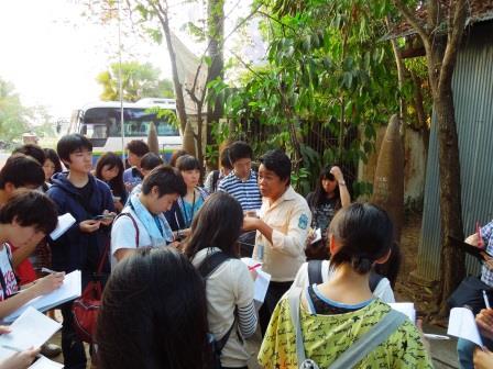 前日の遅い到着のため、出発時間を少し遅らせることになりましたが、訪問先のご協力を得て、予定通りに2日目の行程を実施することができました。カンボジア国内の移動はバスです。道中は舗装が不十分な箇所もあり、移動自体が体力を消耗するハードな時間です。しかし、自ら希望し参加した生徒たちは、道すがらの景色も含めて楽しみながら多くのことを感じ取っておりました。そして、長時間の移動中に、チーム内でコミュニケーションを取り、生徒同士の親交も深まっていきました。