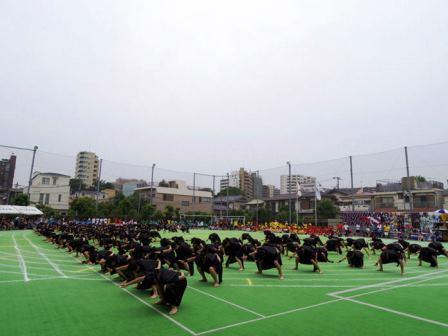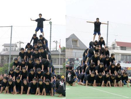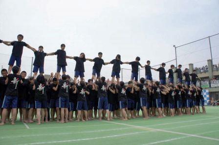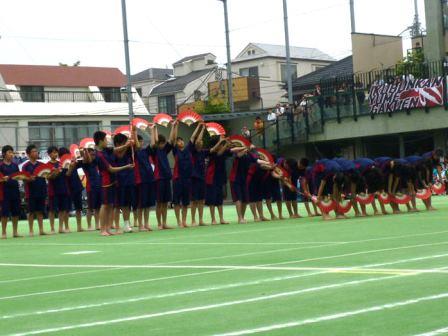 また、中学の体育祭では学年全員が一つの出し物をします。中学1・2年生合同で「ソーラン節」、中学2年生が「扇の舞」、中学3年生は「組体操」と、各学年が一丸となって、見ている生徒、教員、保護者に感動を与えてくれます。