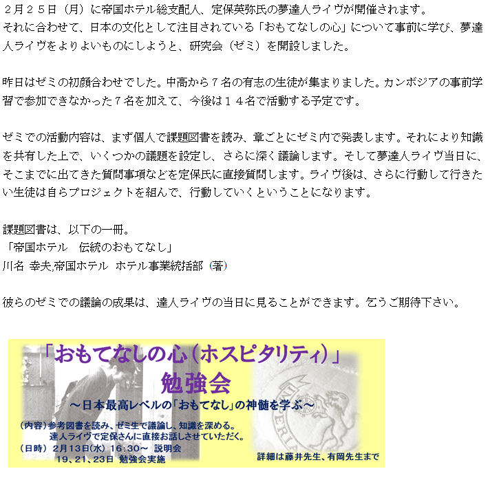 帝国ホテル総支配人による夢達人ライヴ&おもてなしゼミ開催!