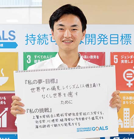 上智大学総合人間科学部社会学科に入学する。社会学、心理学、経済学など多方面から追究する。海外研修で新たな発見をする